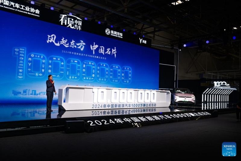 Η φωτογραφ?α δε?χνει την τελετ? που σηματοδοτε? το ορ?σημο των 10 εκατομμυρ?ων μον?δων σε ετ?σια παραγωγ? ν?ων ενεργειακ?ν οχημ?των τη? Κ?να?, στη Γουχ?ν, επαρχ?α Χουμπ?ι. 14/11/2024.